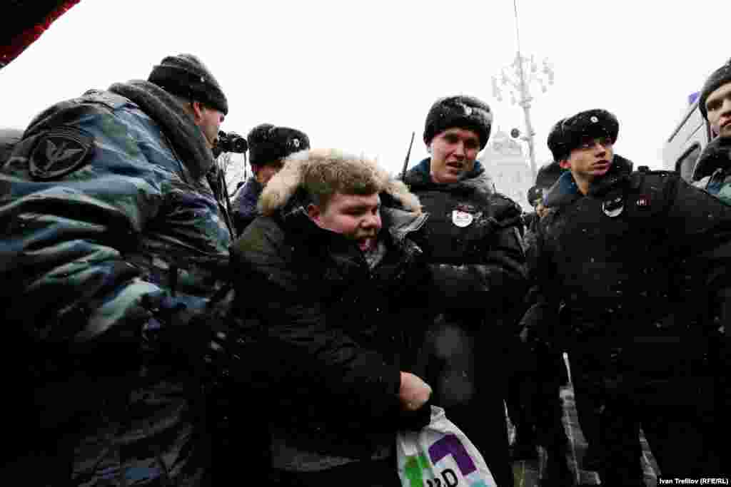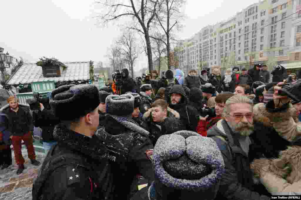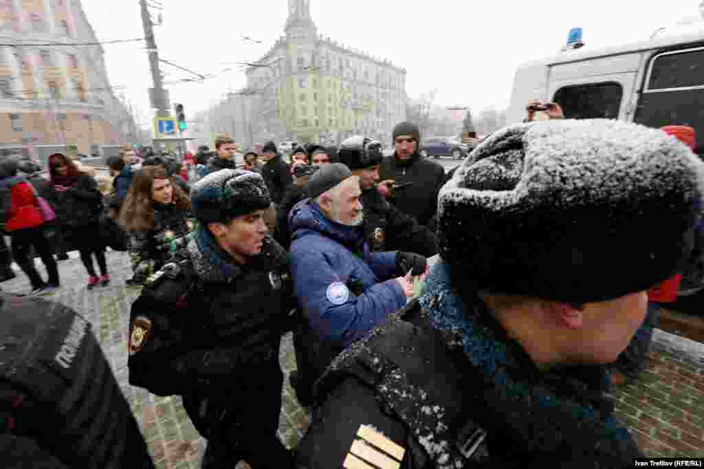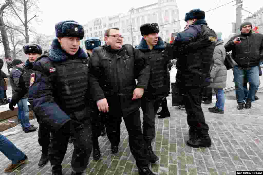 В связи с этим группа гражданских оппозиционных активистов попыталась собраться 12 декабря на Пушкинской площади. Полиция их действия пресекла, более 30 человек были задержаны. Среди них члены партии "Яблоко", включая ее лидера Сергея Митрохина, правозащитник Лев Пономарев и журналист Александр Рыклин, а также один из авторов Конституции России, бывший помощник президента Бориса Ельцина Георгий Сатаров.