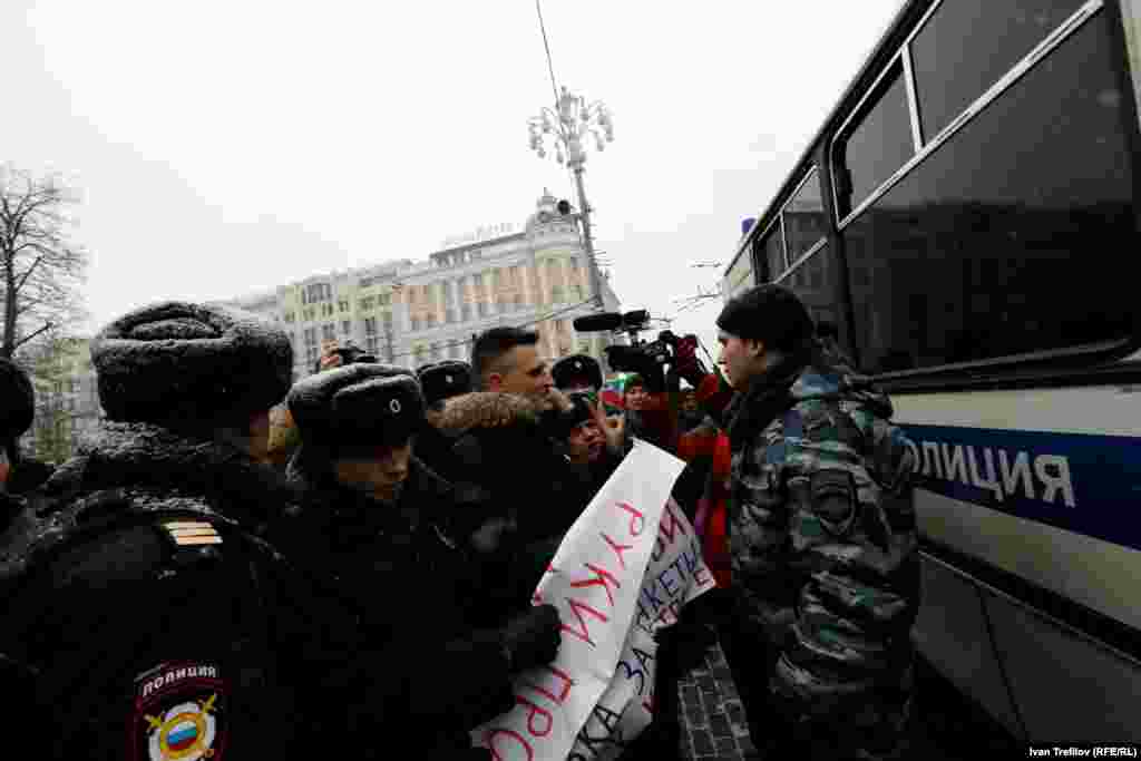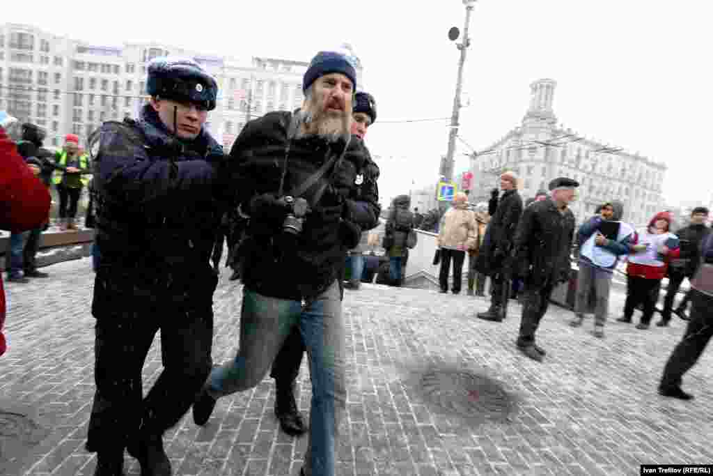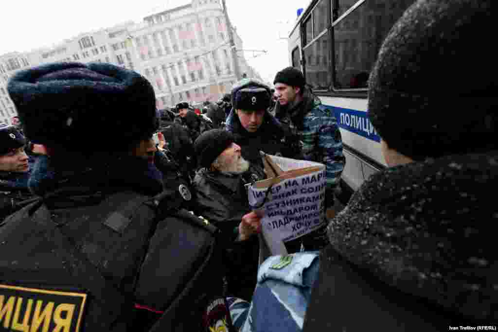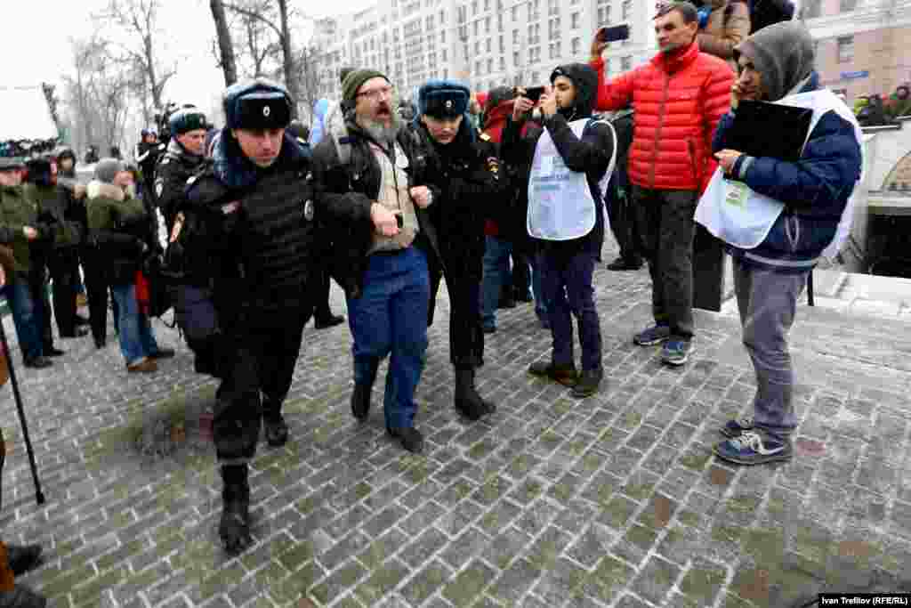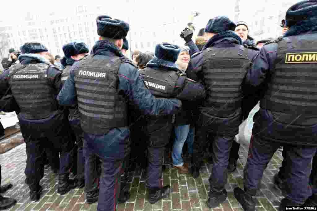 В связи с этим группа гражданских оппозиционных активистов попыталась собраться 12 декабря на Пушкинской площади. Полиция их действия пресекла, более 30 человек были задержаны. Среди них члены партии "Яблоко", включая ее лидера Сергея Митрохина, правозащитник Лев Пономарев и журналист Александр Рыклин, а также один из авторов Конституции России, бывший помощник президента Бориса Ельцина Георгий Сатаров.