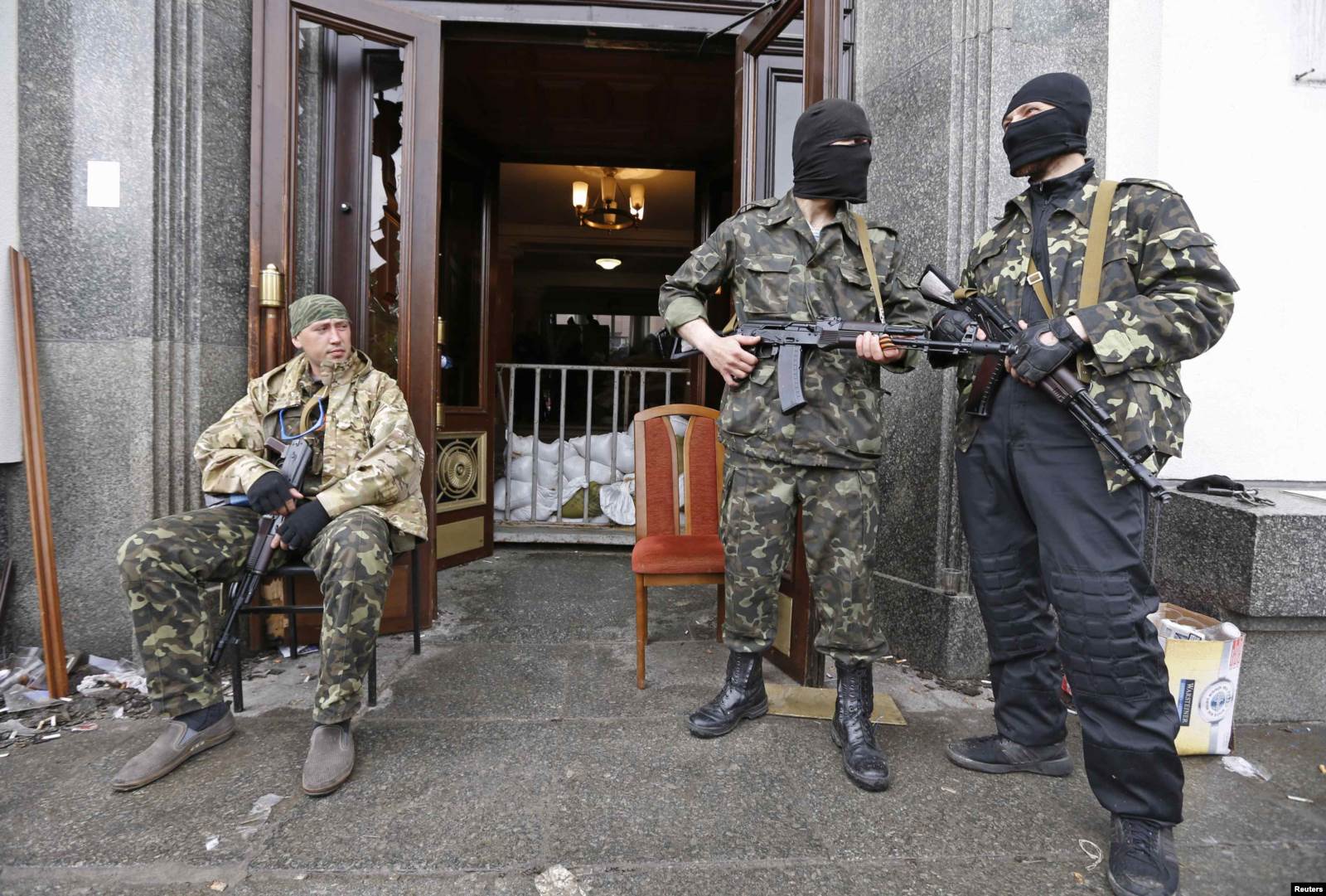 Вооруженные представители пророссийских сил возле здания областной администрации в Луганске 29 апреля 2014 года. Фото: Reuters