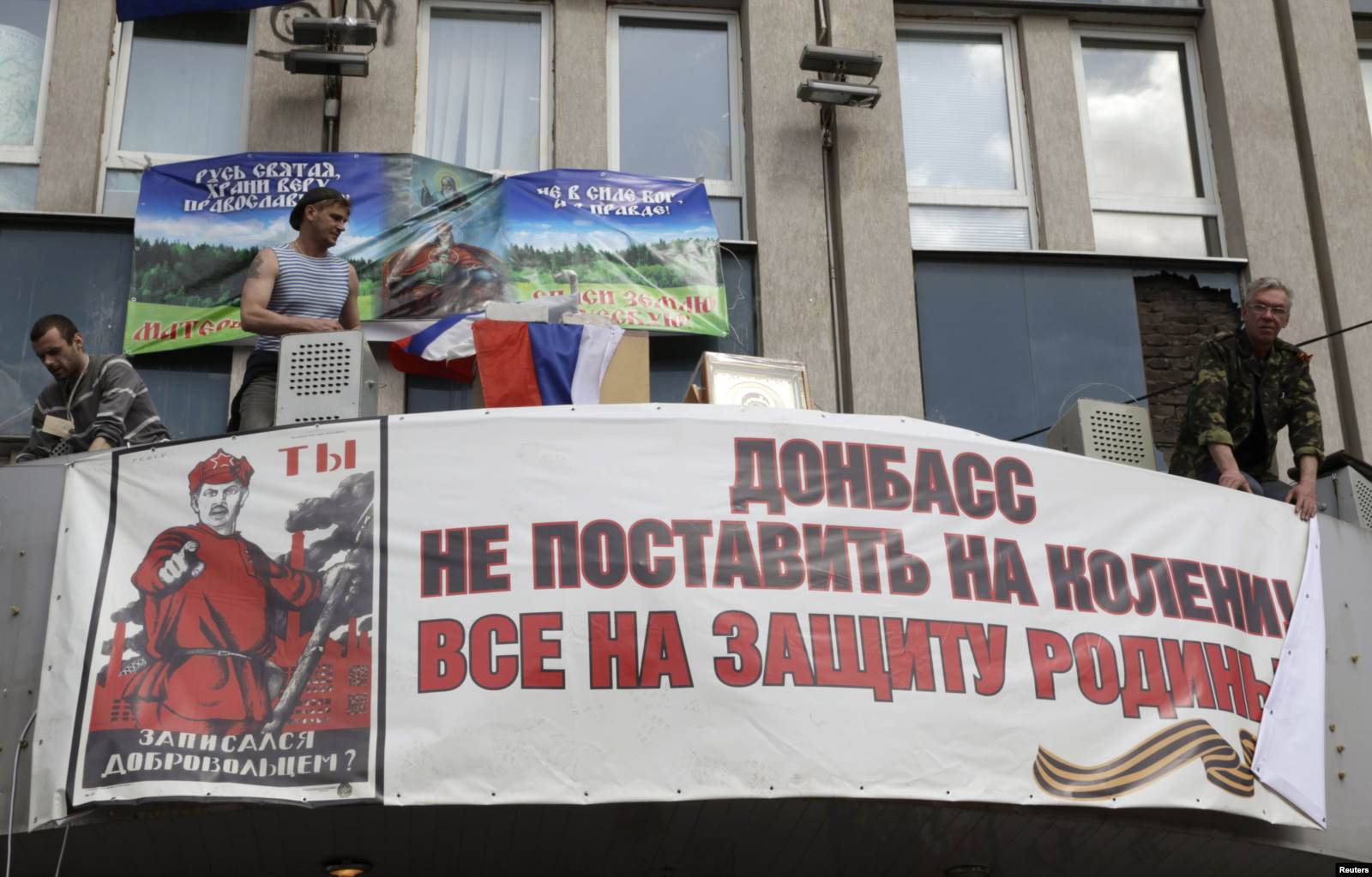 Захватившие здание СБУ в Луганске участники пророссийского митинга, 18 апреля 2014 года. Фото: Reuters