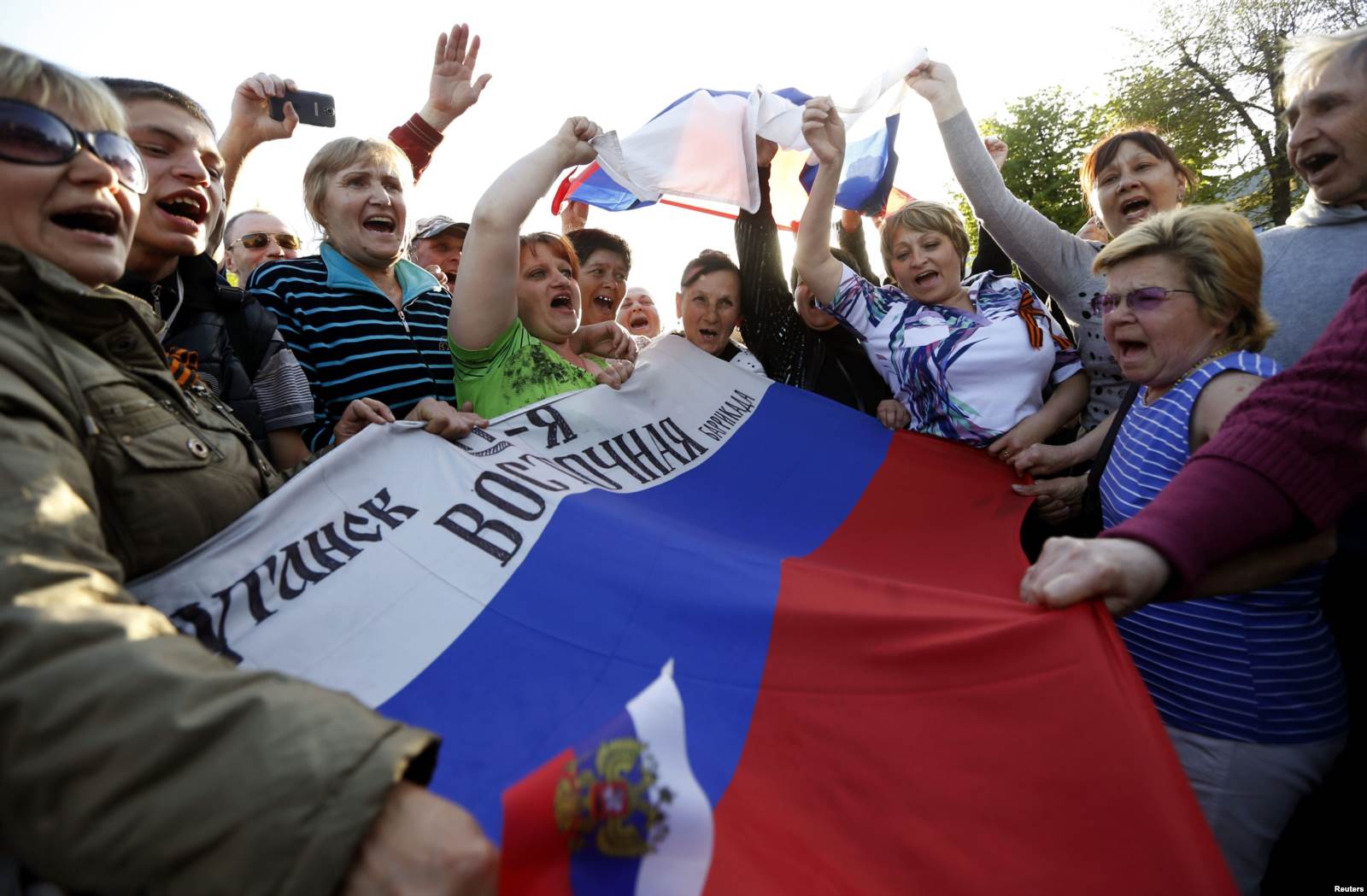 Пророссийски настроенные митингующие возле здания СБУ в Луганске, 27 апреля 2014 года. Фото: Reuters