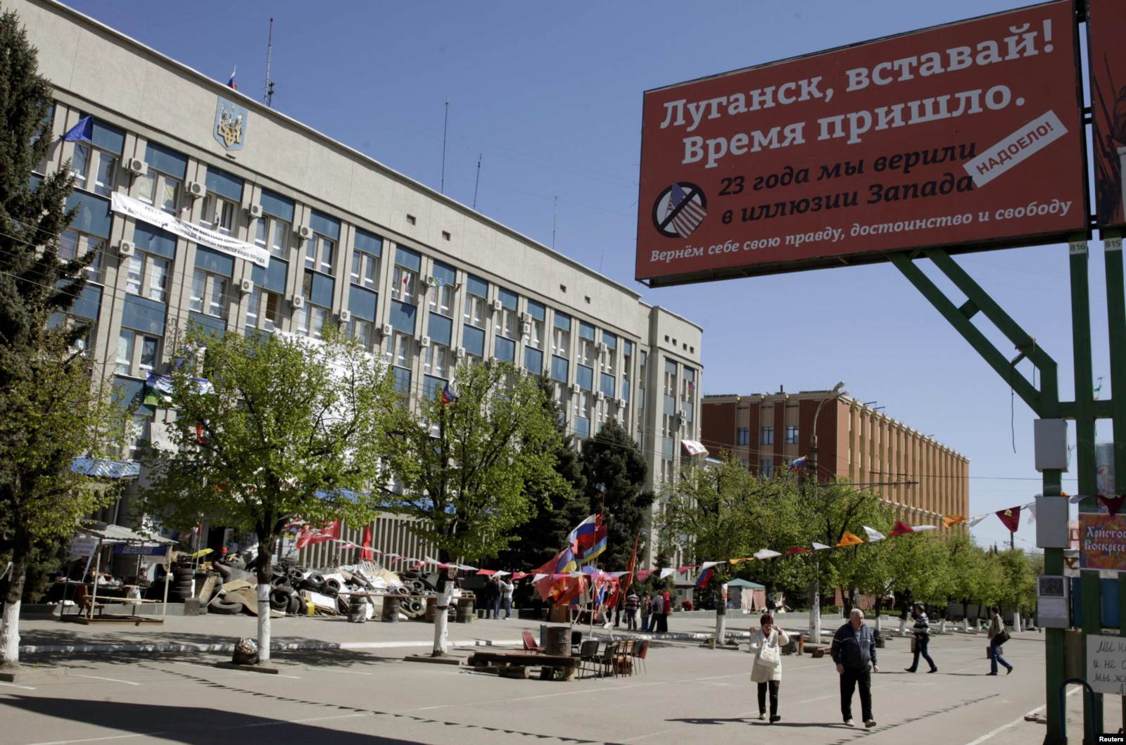 Призывы к референдуму на столбах возле здания СБУ в Луганске, 28 апреля 2014 года. Фото: Reuters