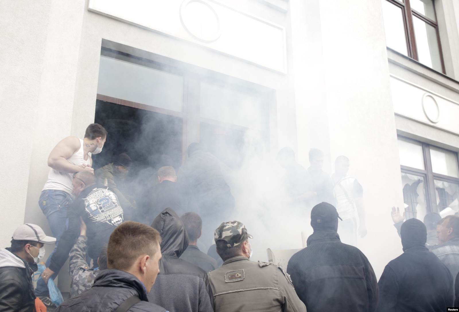 Митингующие выломали двери, разбили стекла и ворвались в здание областного управления, после чего захватили оружейную комнату с большим арсеналом оружия.