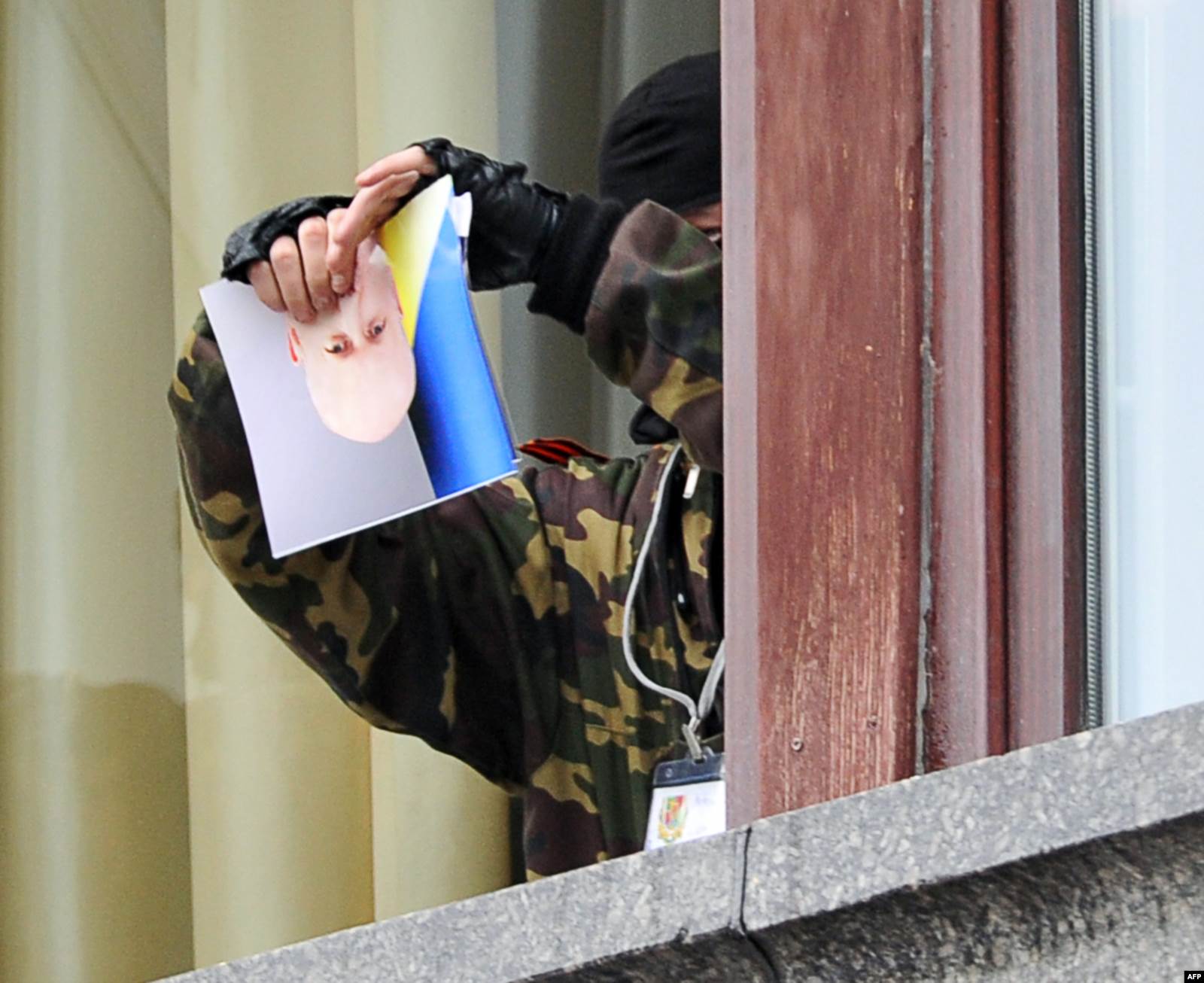 Один из вооруженных участников захвата здания областной администрации в Луганске разрывает портрет и.о. президента Украины Александра Турчинова. 29 апреля 2014 года. Фото: AFP