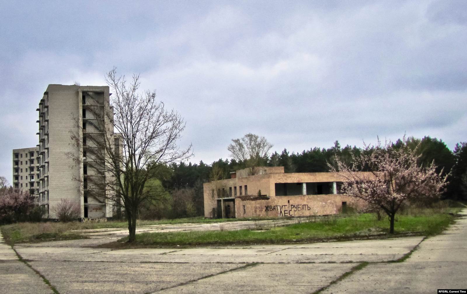 Апокалиптическая картина дополняется звуковым рядом – далеким лаем собак и пением петухов. Пройдя на звук по натоптанной тропинке несколько сотен шагов, за огромными соснами неожиданно можно обнаружить два жилых пятиэтажных дома.