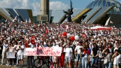 Корреспондент Настоящего Времени Роман Васюкович сообщает, что тысячи людей идут по проспекту Независимости. Они требуют освобождения политзаключенных и скандируют "Уходи!", "Позор!", "Трибунал!", "Выпускай" и требуют смены власти.