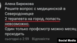 Жители жалуются, что сложно записаться даже на первичный прием к врачу. К примеру, на весь Северодонецк сегодня работают только два терапевта, и, чтобы записаться к ним, надо занимать "живую" очередь с ночи. А это грозит проблемами и возможным задержанием из-за все еще действующего в районе комендантского часа.