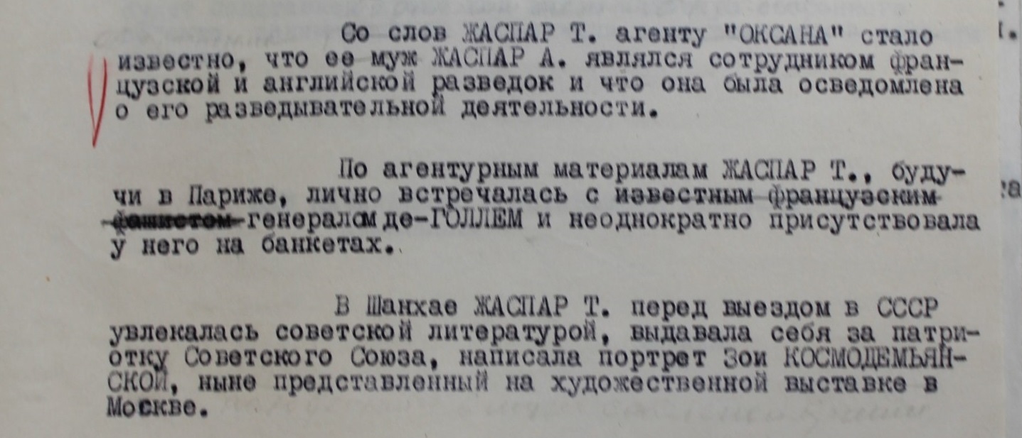 Каждый из тысяч эмигрантов, возвращавшихся в СССР в послевоенные годы, попадал в поле зрения советской спецслужбы. Одних вербовали, других арестовывали, третьи жили под присмотром. Судя по тому, сколько внимания уделялось Жаспар, ее случай был особым. Материалов на «Католичку» (такой псевдоним присвоили ей в МГБ) за годы разработки накопилось на пять внушительных томов.