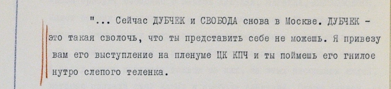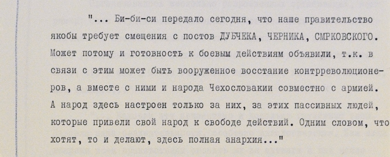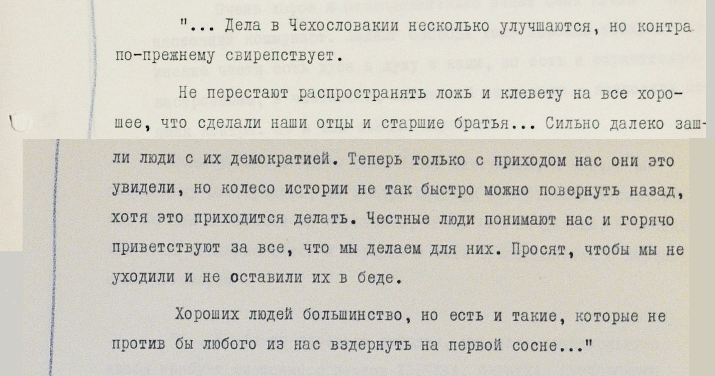 Авторы писем признают: абсолютное большинство чехов и словаков – на стороне “контры”. Сомнений в том, что ввод войск против воли большинства жителей страны нужен и оправдан, никто в переписке не высказывает.