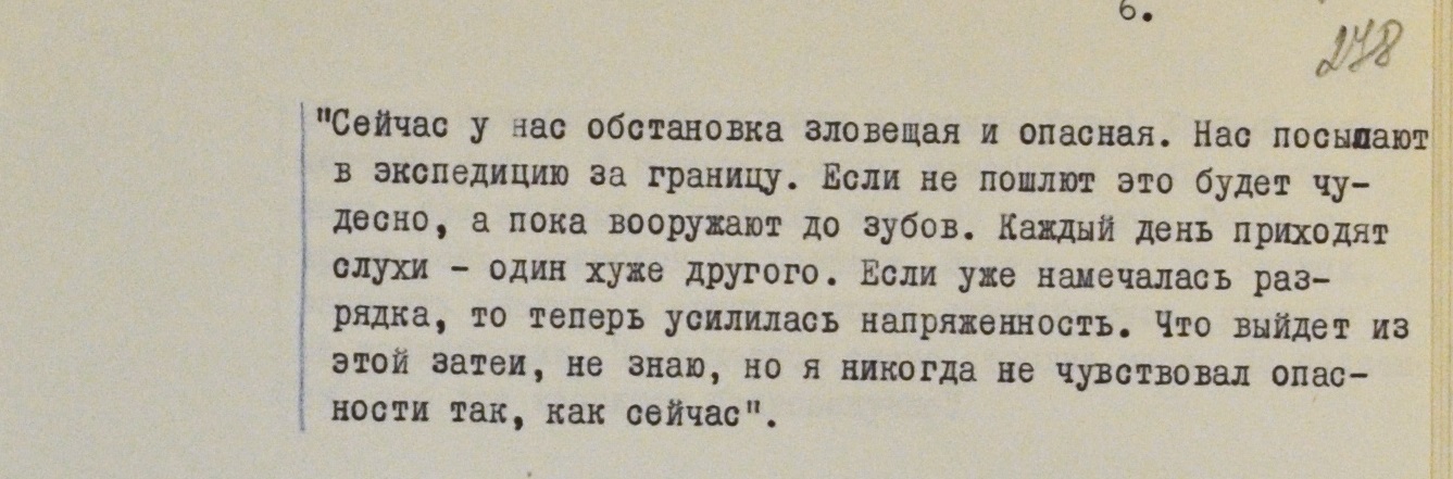 “Нас посылают в экспедицию за границу. Если не пошлют это будет чудесно, а пока вооружают до зубов. Каждый день приходят слухи – один хуже другого”, – отмечал он в письме, которое было перехвачено кгбшниками.