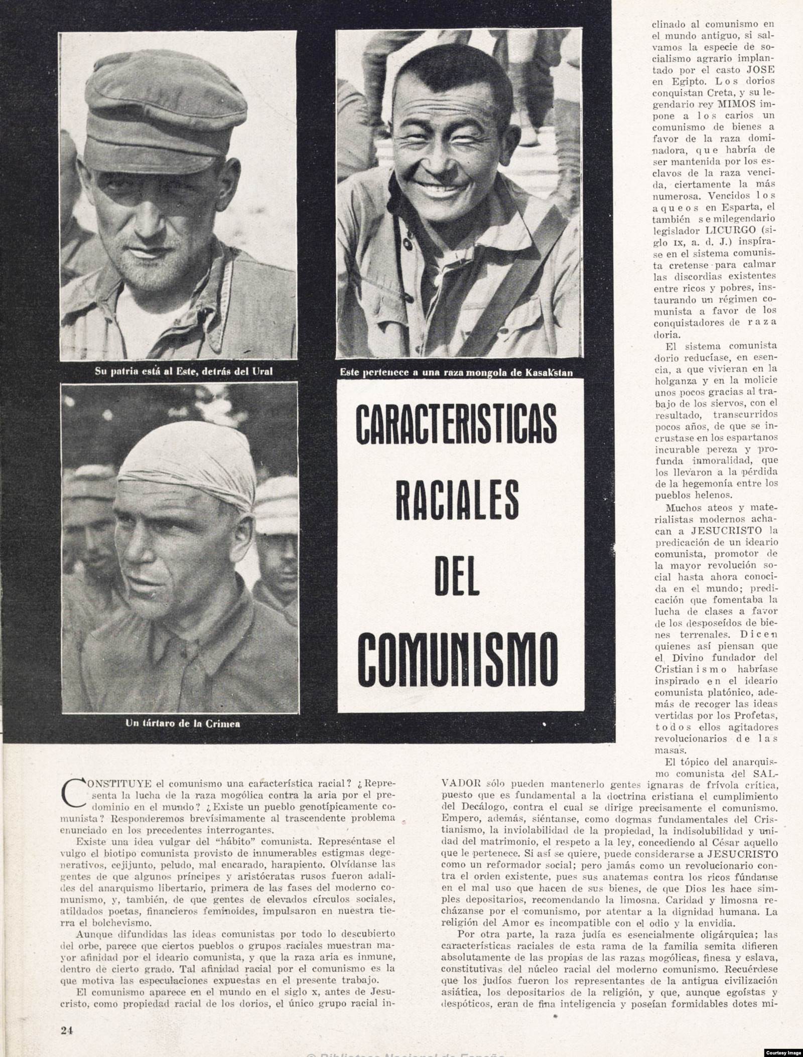 Испанская пропаганда охотно использовала немецкие фотографии и видео. Характерная для гитлеровских СМИ тема "расового превосходства" не подчеркивалась постоянно, но периодически затрагивалась. "В соответствии со своими биологическими характеристиками коммунизм может распространяться исключительно среди рас деградирующих, лишенных веры в собственное предназначение, не имеющих никаких ценностей. Они не способны улучшаться и стремиться превзойти других людей в цивилизационном смысле. Коммунизм – это возвращение к первобытному обществу, к человеку дикому", – объясняла статья "Расовые характеристики коммунизма" в рождественском номере "Легионов и Фаланг" за 1941 год.