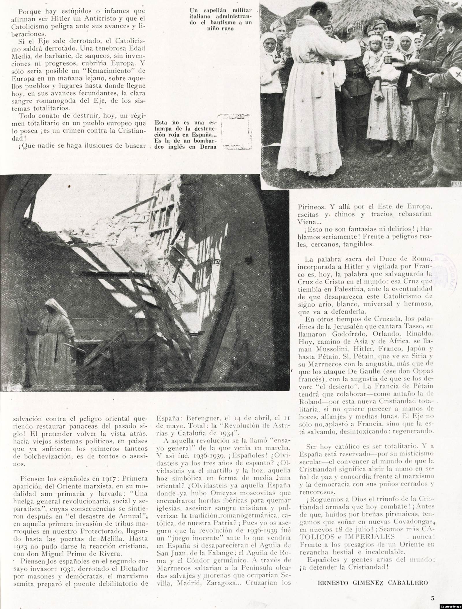 Статью иллюстрировала фотография с подписью "Итальянский капеллан крестит русского ребенка". На снимке босые крестьянки, одна из них с ребенком на руках, стоят в плотном окружении военных. В киножурналах того времени испанцам показывали, как в оккупированных Украине и Беларуси местные жители, "освобожденные" немецкой армией от атеизма и колхозов, восстанавливали церкви, собирали хлопок, выращивали пшеницу и пекли хлеб по новейшим европейским технологиям. И все это исключительно по доброй воле.