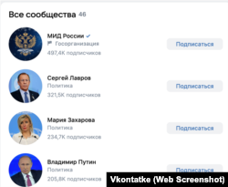 На странице Витовой во "ВКонтакте" можно найти подписки на аккаунты МИД России, его главы Сергея Лаврова, спикера МИД Марии Захаровой, а также президента России Владимира Путина.