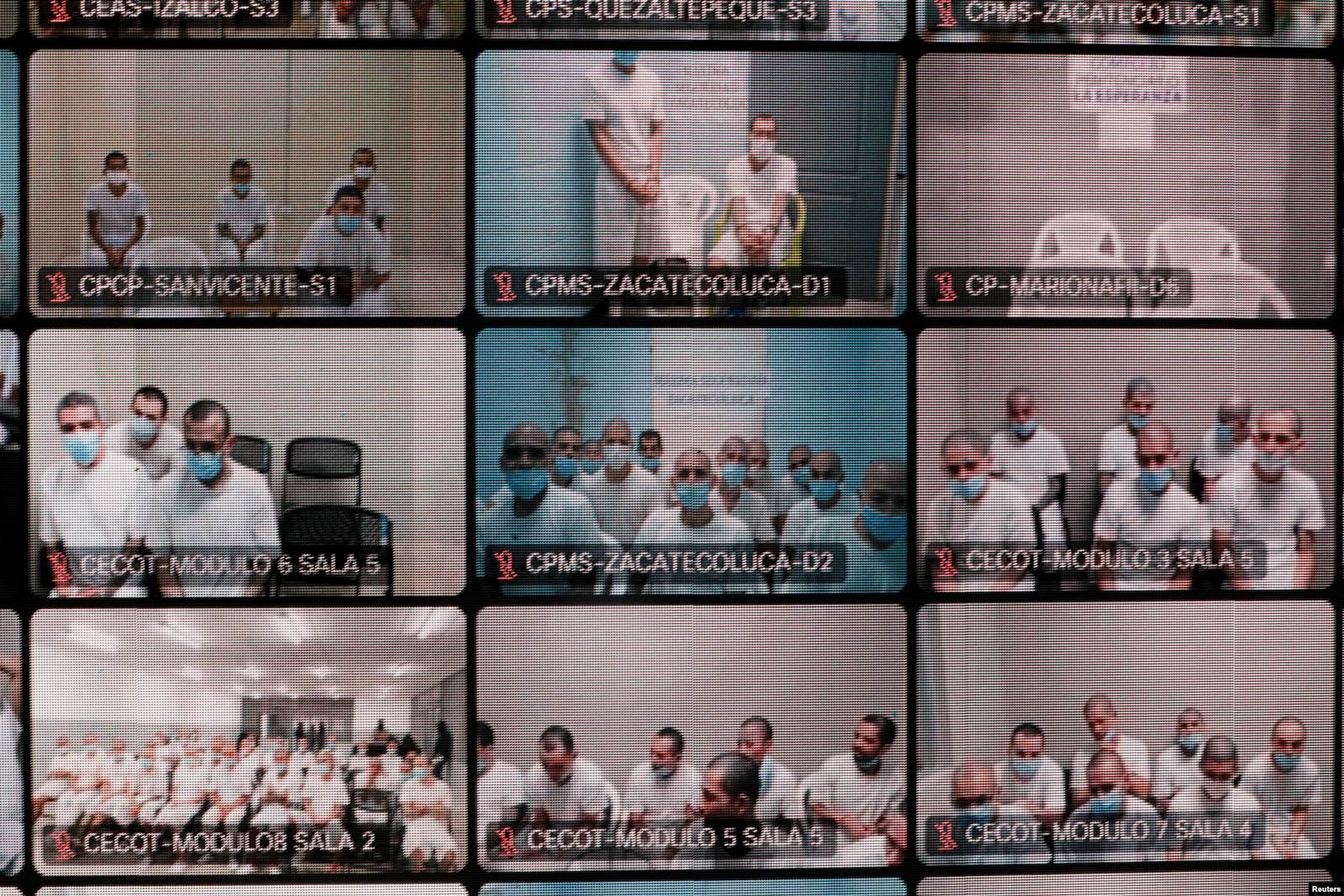 Обвиняемые в совершении преступлений в банде Мара Сальватруча участвуют в одном из заседаний массового судебного процесса, во время которого в суде Сан-Сальвадора одновременно судят около 500 человек. 8 февраля 2024 года. Фото: Reuters