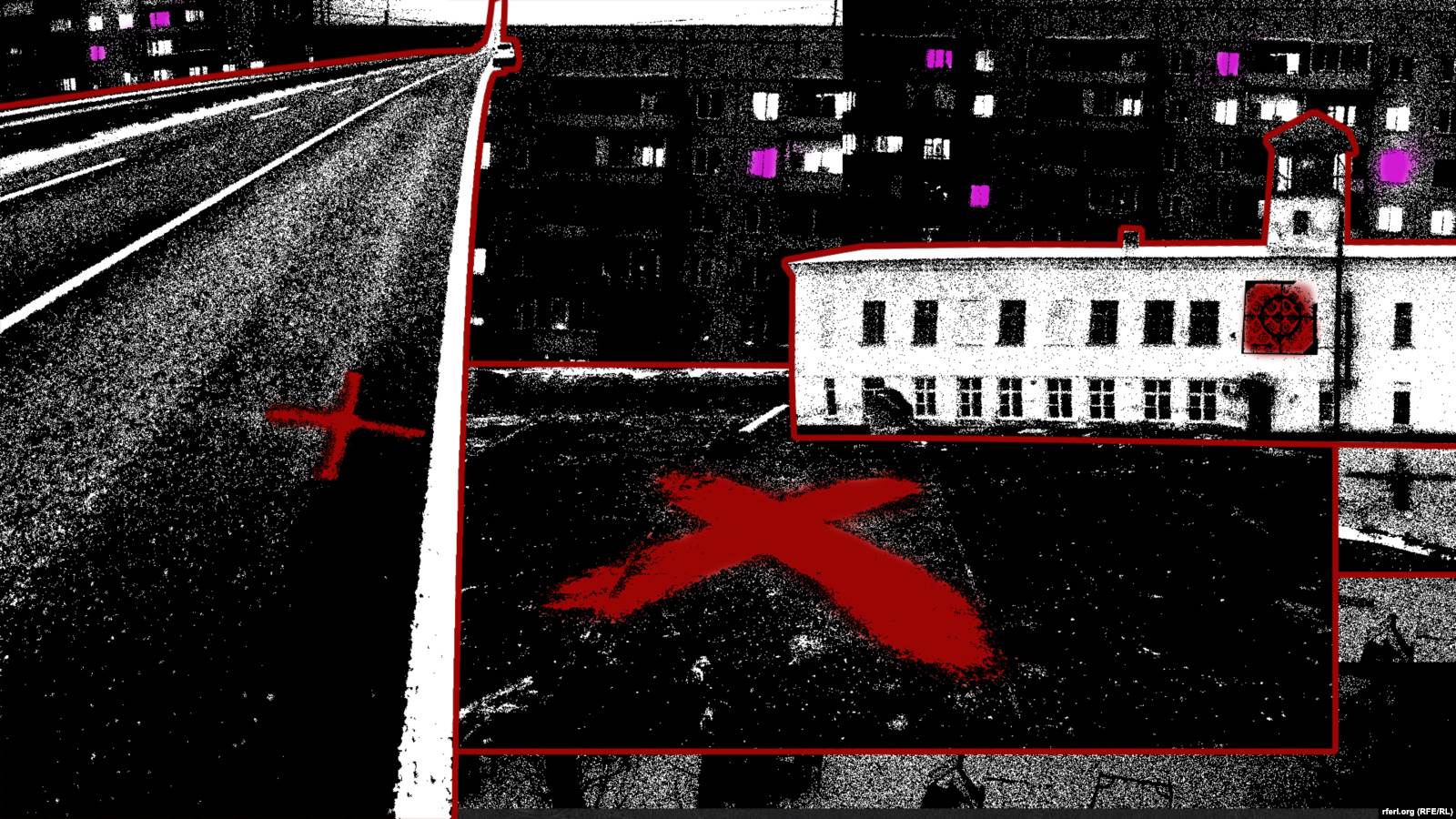 "Пять меток. Такие как на девятой школе. Метка в виде крестика. Креста. Красный. Возле "Правого сектора" под мостом, возле отделения полиции, на второй шахте две метки. И после этого я все фоткала и передавала эти фотографии".