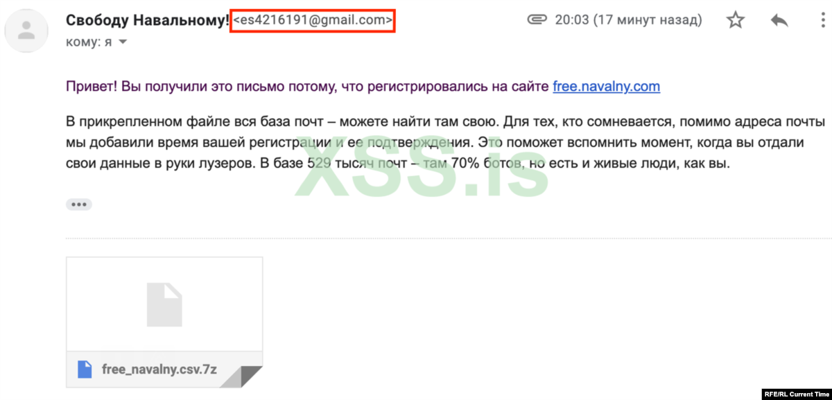 Первый пост scs опубликовал 15 апреля: он содержал скриншот письма сторонникам Навального с предложением "вспомнить тот момент, когда отдали свои данные в руки лузеров". Письмо, утверждал тогда scs, пришло в том числе на его ящик. На скриншоте был указан отправитель – es4216191@gmail.com, адрес зарегистрирован на "Елену Сафронову". Настоящее Время опросило 30 человек, получавших спам про Навального в этом году, и ни одному из них не знаком имейл "Елены".