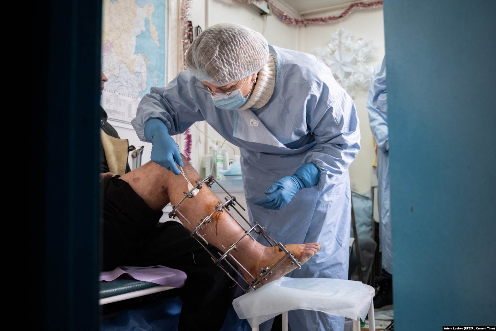 Ирина Сафонова осматривает пациента с аппаратом Илизарова, установленным после получения производственной травмы