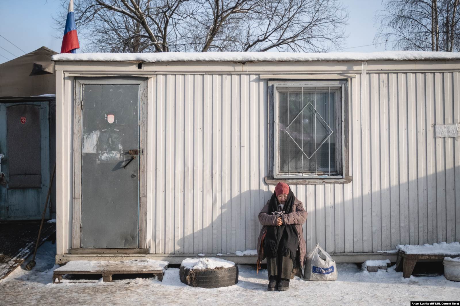 Бездомная женщина ожидает приема врачей у медицинского вагончика в приюте Мальтийской службы помощи