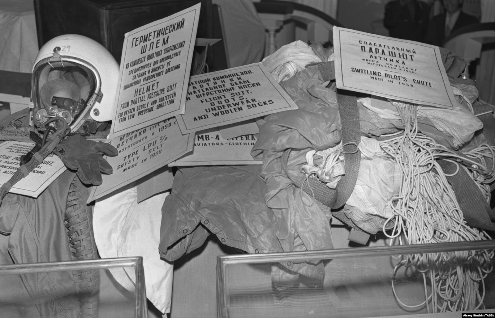 Шлем, парашют и экипировка Пауэрса, которые впоследствии демонстрировали в суде как доказательство его шпионской деятельности. Фото: ТАСС