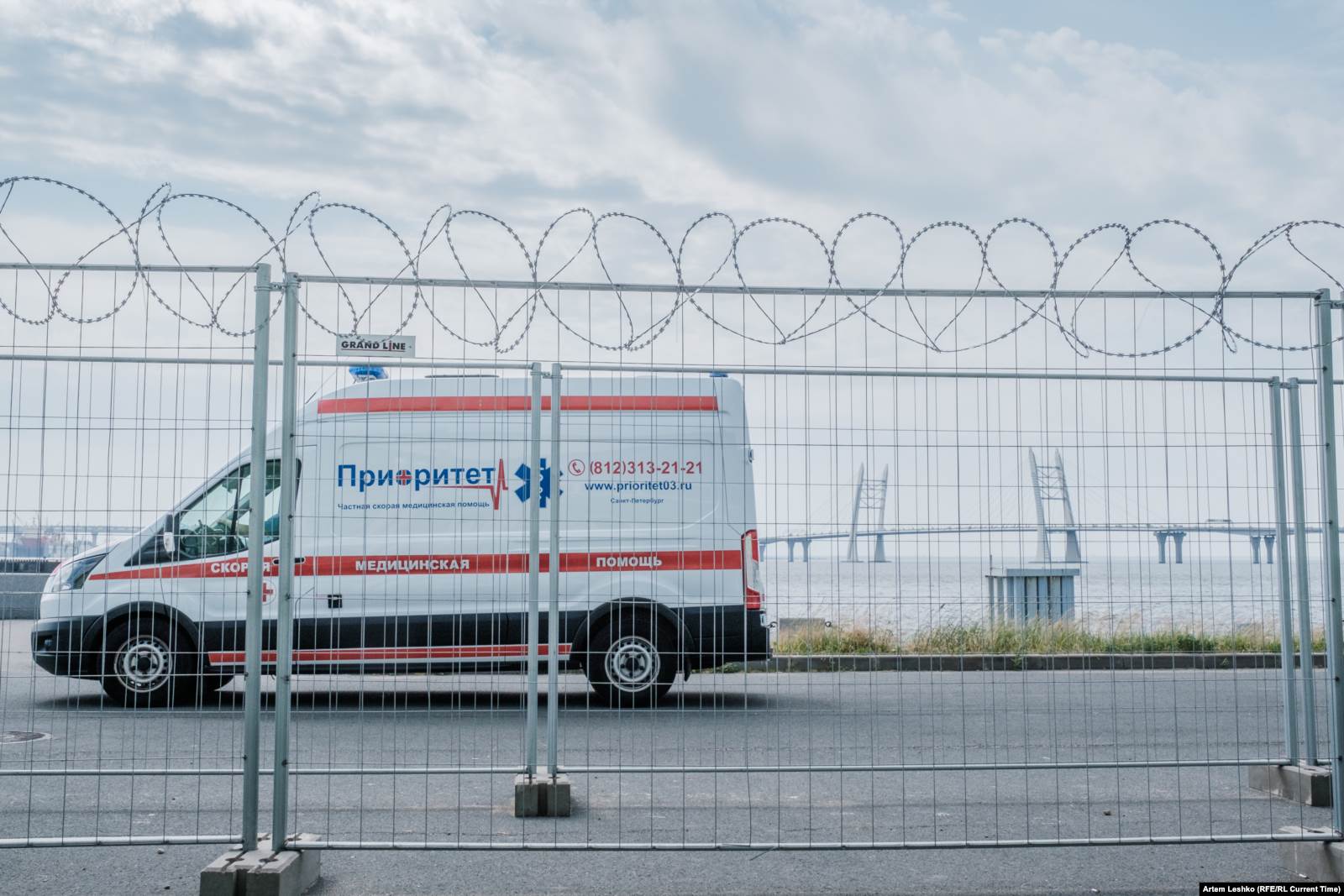 Машина скорой помощи отъезжает от пятого павильона временного госпиталя "Ленэкспо" после госпитализации больного