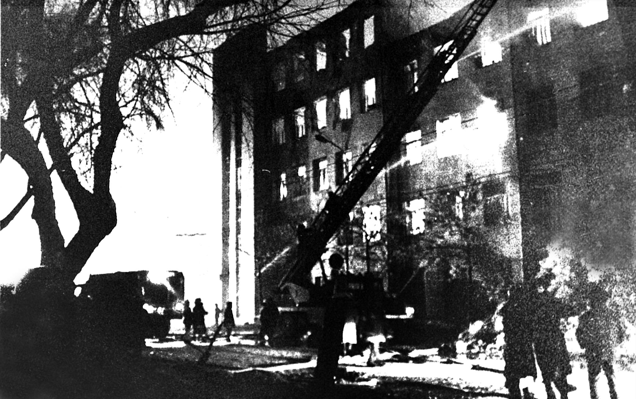 Женщина забежала обратно в кабинет и закрыла за собой дверь — плотную, деревянную и без щелей — в отличие от других кабинетов, в которых часть дверей были с дырами. Это позволило Киселевой выиграть время, дым долго не проникал в помещение. Подойдя к окну, она увидела языки пламени из соседних кабинетов и стала звать на помощь.