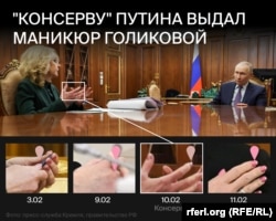 10 февраля Кремль отчитался о встрече Путина с Голиковой. На этой встрече у Голиковой маникюр пыльно-розового цвета. Хотя ровно за день до публикации встречи в Кремле и на следующий день после этого на публичных мероприятиях ногти Голиковой были покрашены в более яркий розовый оттенка "Барби". При этом такой же пыльно-розовый, как на встрече с Путиным, Голикова носила в первых числах февраля 2026 года – тогда предположительно и была записана эта "консерва".