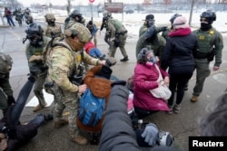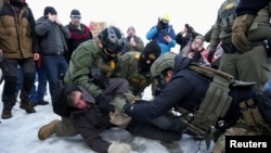 На фото видно, как полицейские задерживают как минимум одного человека и валят его в снег, СМИ сообщают, что на протесты вышли "тысячи" человек.