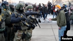 На одном из видео, опубликованных 8 января, сотрудник правоохранительных органов в камуфляже стреляет оранжевой смесью в лицо протестующему.
