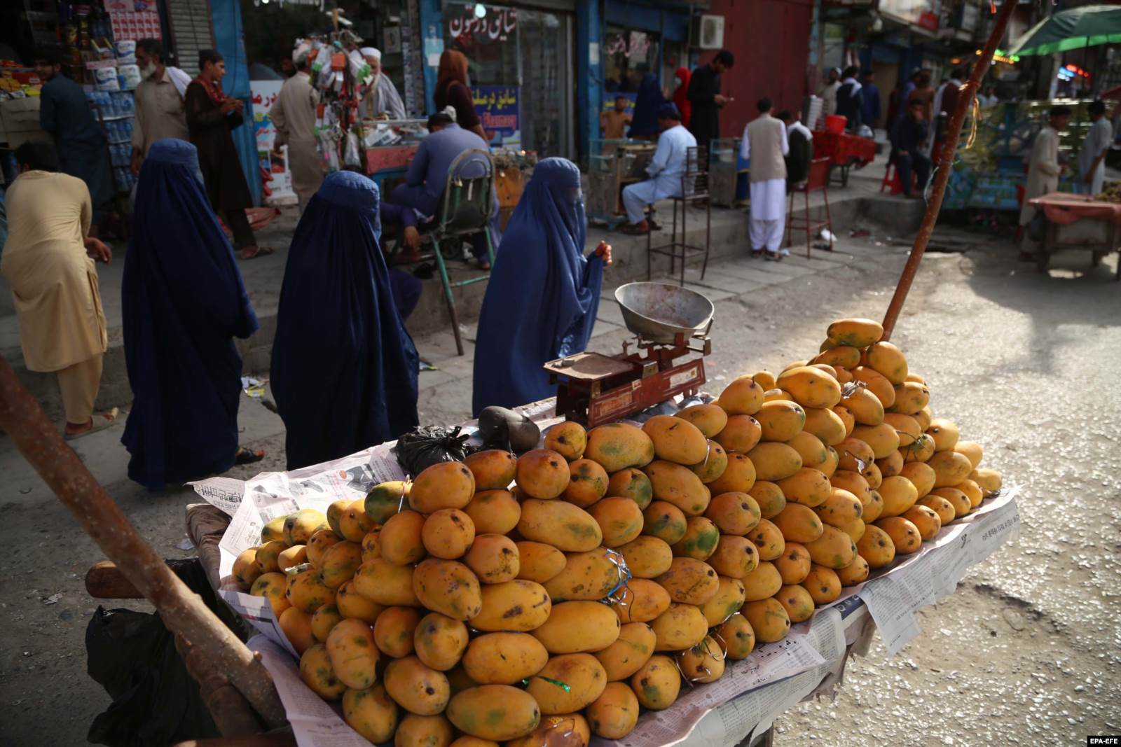 Женщины в бурках возе стенда с манго в Кабуле. 18 августа 2021 года