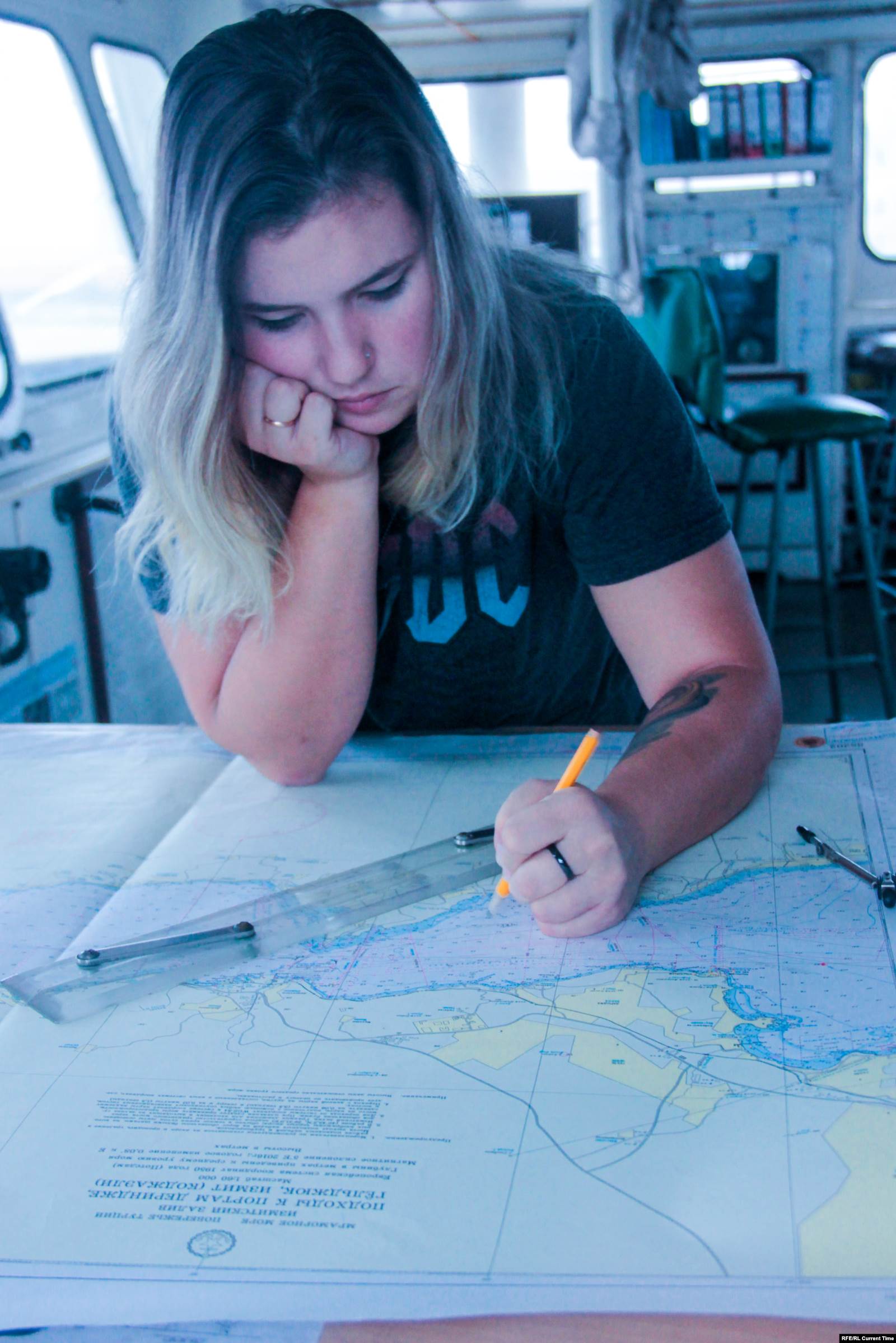 Я работаю с картами и судовыми документами, навигационными и метеорологическими предупреждениями. Авторулевого у нас нет, поэтому я еще и сама непосредственно рулю, удерживаю вручную судно. Я работаю с 8 до 12 и с 20 до 24 каждый день без выходных. В свободное время на судне я стараюсь поспать, потому что отведенных на сон семи часов мне не хватает. Но чаще выполняю ту бумажную работу, которую не могу сделать во время вахты: заполнением бортовых журналов и оформлением корректуры. Из-за того, что нет авторулевого, я могу отойти от штурвала максимум на минуту, поэтому ничем другим в этот момент заниматься невозможно.