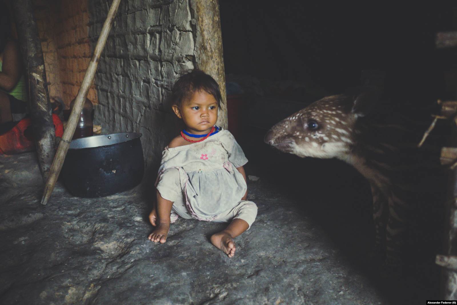 Ребенок яномами и детеныш тапира. Диких животных часто отлавливают маленькими и какое-то время содержат как домашних.