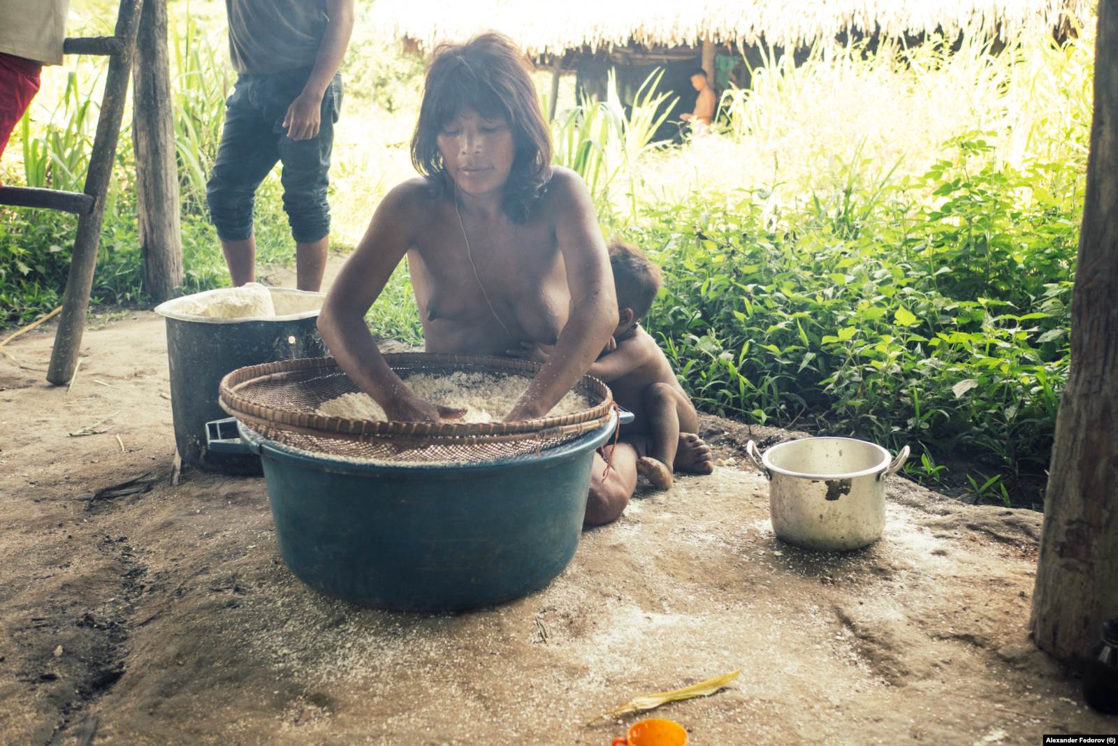Основной продукт питания яномами – горький маниок, корнеплод с высоким содержанием цианида. Чтобы сделать пищу из него безопасной, маниок измельчают, отжимают, а затем высушивают на солнце.