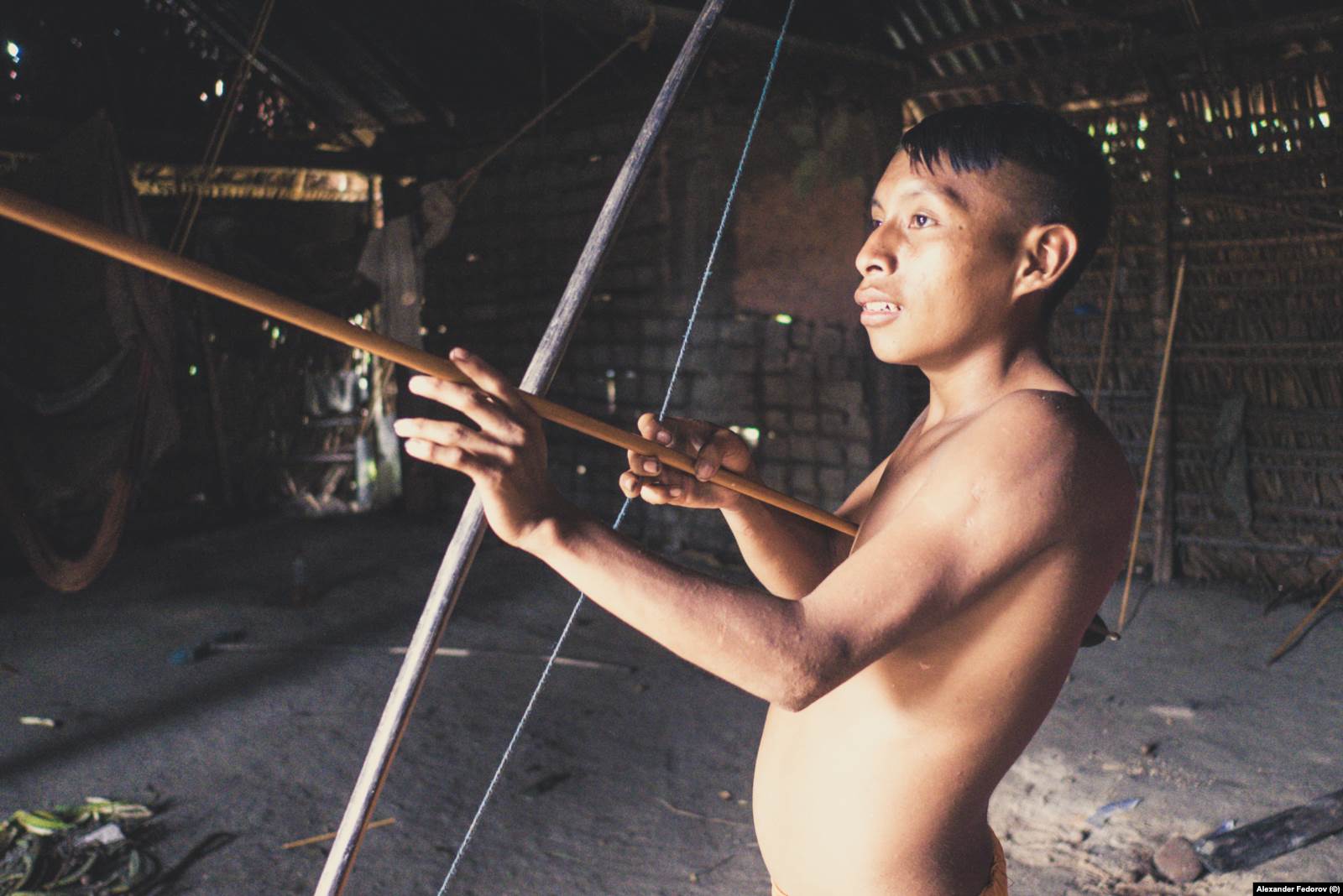 Житель общины Окамо по имени Дарвин Гусман демонстрирует традиционный лук яномами.